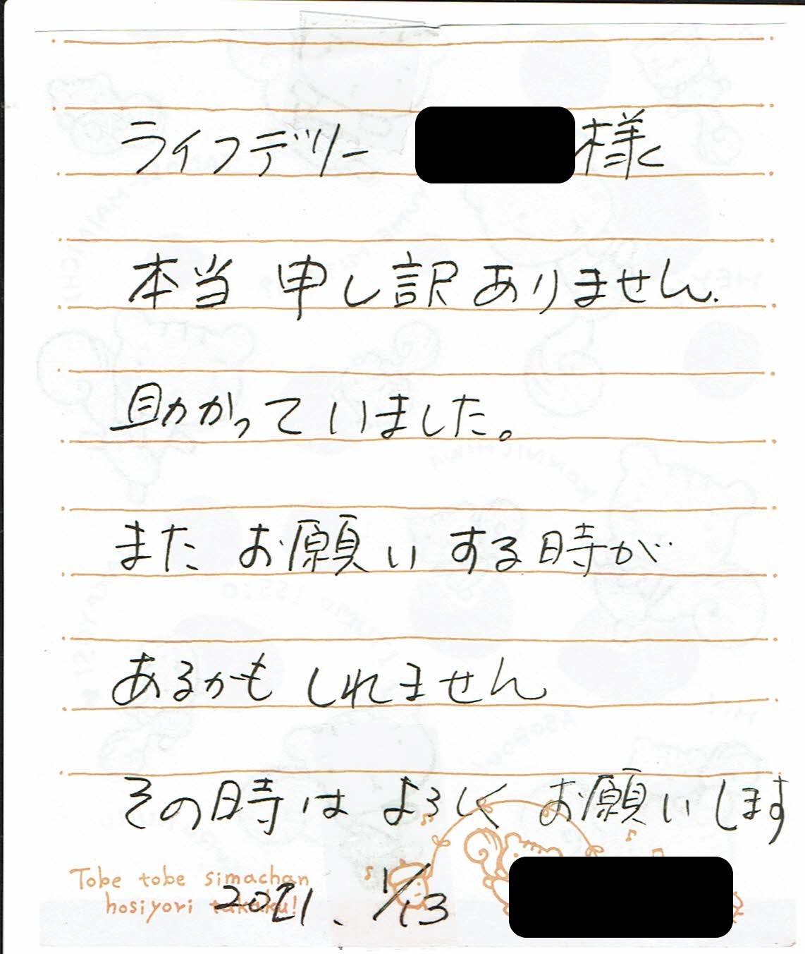 ライフデリ福岡西店へのお手紙をご紹介します。