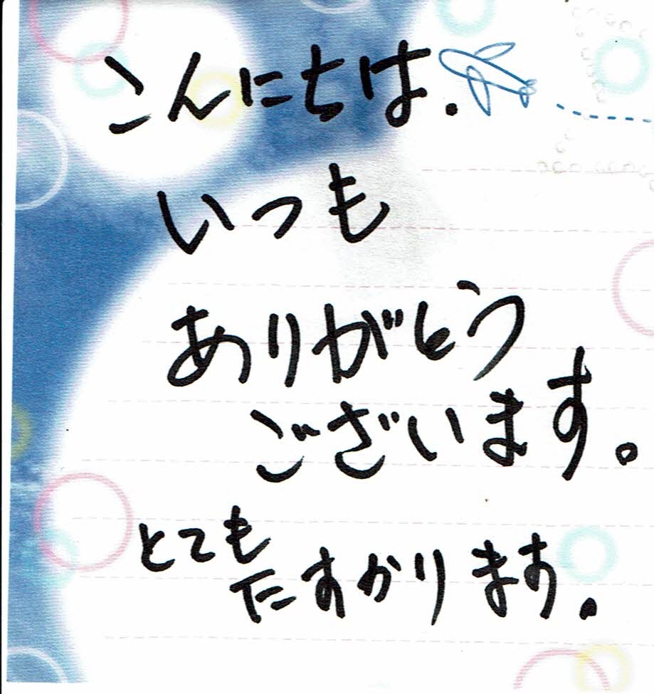 「こんにちは、いつもありがとうございます。とても助かります、というお手紙を頂戴しました。」とのことです。