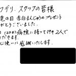 「・敬老の日に当たりましての祝いのお心使いありがとうございました。紅白の菓子、赤飯ともどもありがたくいただきました。心よりお礼申し上げます。御社の益々の御発展を心より御祈り申し上げ御礼とさせていただきます。 ・敬老の日 紅白万十 ありがとうございました。おいしかったです。」とのことです。