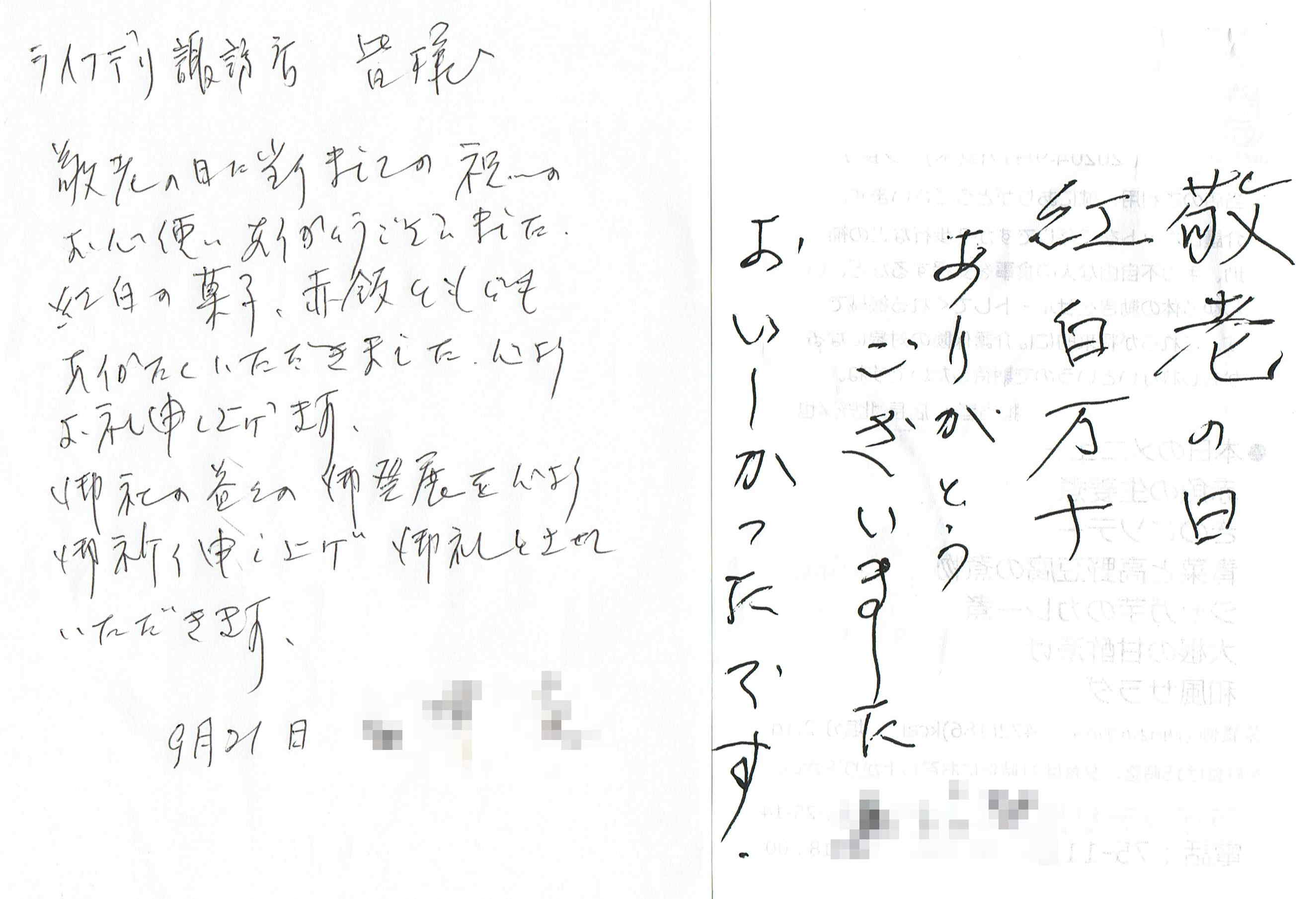 敬老の日にご利用者様にお祝いの紅白饅頭とお手紙を添えてお届けいたしました。そのお礼のお手紙を2通頂戴いたしました。ありがとうございました。