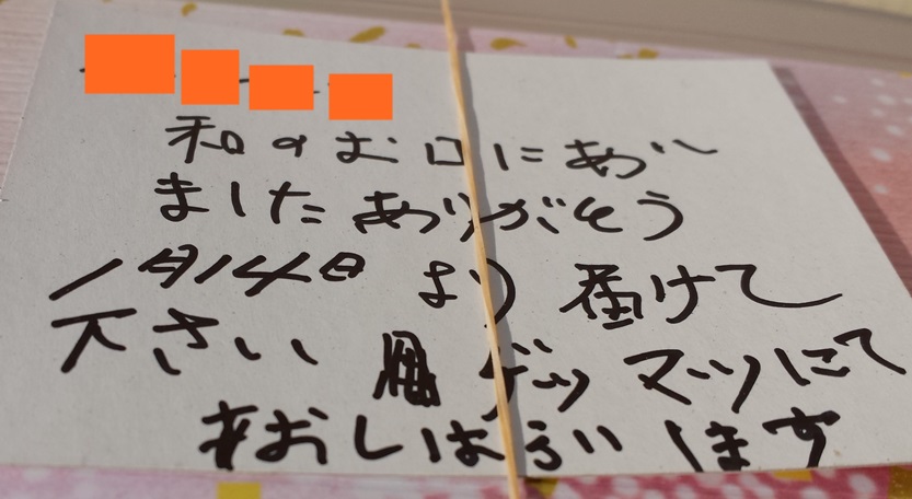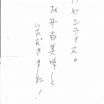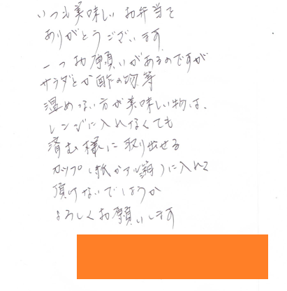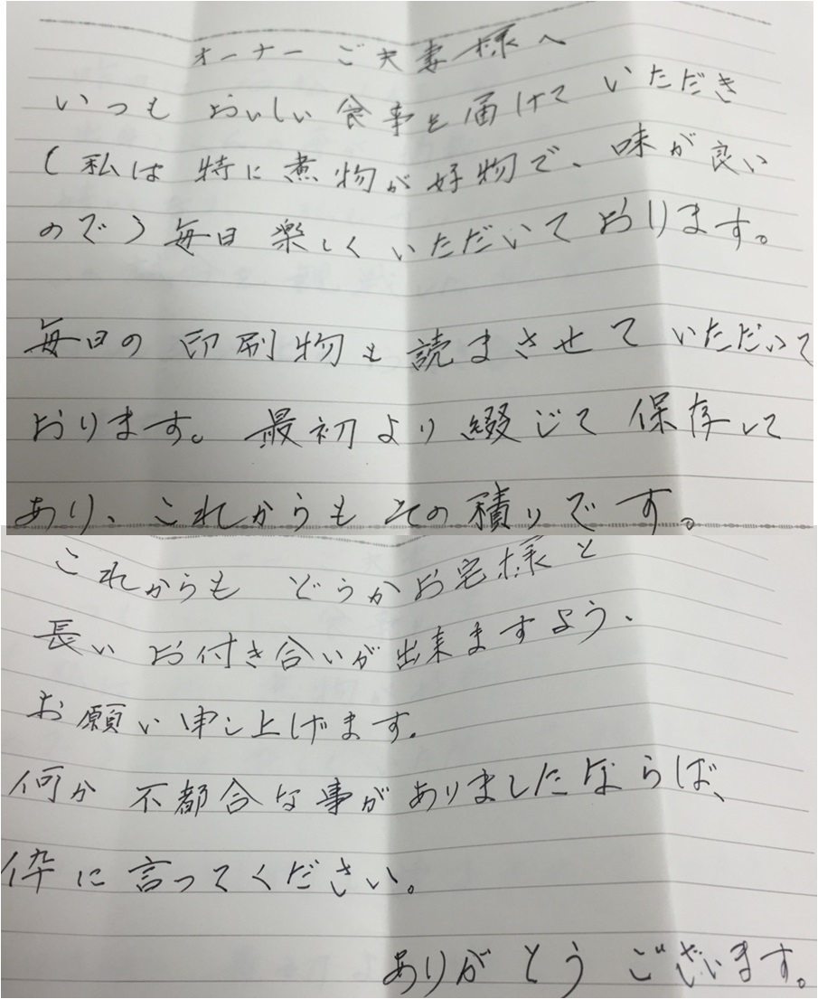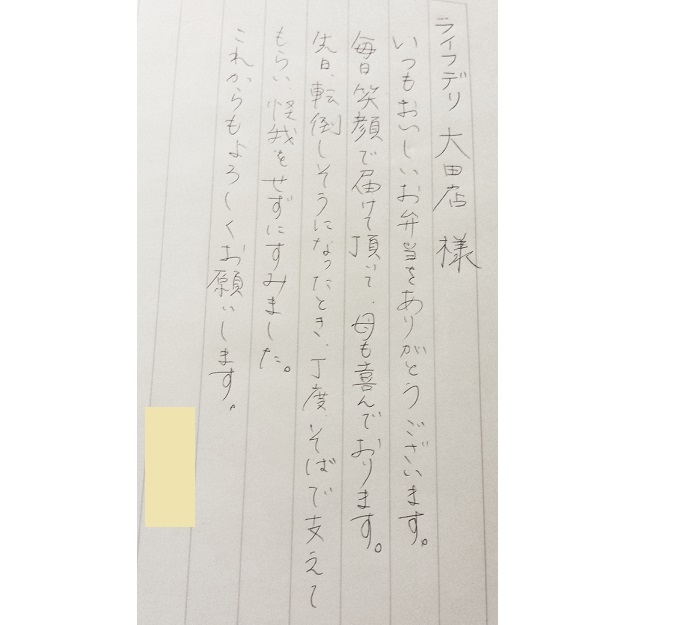お客様の声2021.04.02 DELILIFE ライフデリ諏訪店にお手紙を頂戴しました! ライフデリ諏訪店へのお手紙をご紹介します。 「良い物が体にききます。いつもうれしく食事をしております。有りがとうご座います。」とのことです。 ケアマネ様からご紹介頂き、昼夕と8ヶ月お取り頂いております。耳が遠いので普段はほとんど会話ができないのですが、うれしいお手紙を頂きました。ありがとうございました。 諏訪市・下諏訪町・岡谷市でご高齢向けのお弁当をお探しの方、糖尿病・腎臓病の方は是非、高齢者配食サービスのライフデリ諏訪店にお任せ下さい。