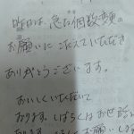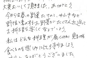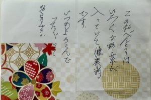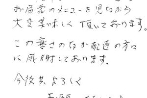 プレオープンの時に試食をご注文頂いた、 地域包括支援センターの社長さんです。 翌日から昼食を月~金でご利用頂いております。 お休みのお願いの際に頂いたお手紙です。ありがとうございました。