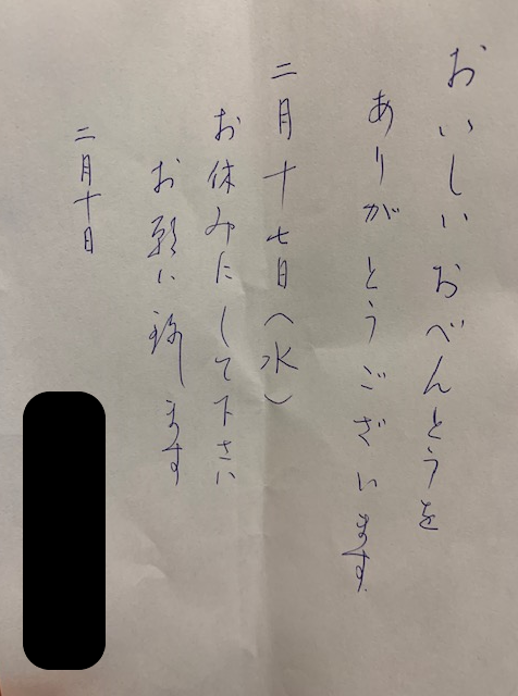 お客様の声2021.02.16 DELILIFE ライフデリ豊田店にお手紙を頂戴しました! ライフデリ豊田店へのお手紙をご紹介します。 「おいしいおべんとうを ありがとうございます」とのことです。 当店をご利用開始から4ヶ月程立ちますが、各業者の試食を試し、市の補助が受けれるのにも関わらず、実費の当店を選んで下さったお客様です。お休みのご連絡の際に頂戴したお手紙です。ありがとうございました。 豊田市でご高齢向けのお弁当をお探しの方、糖尿病・腎臓病の方は是非、高齢者配食サービスのライフデリ豊田店にお任せ下さい。