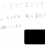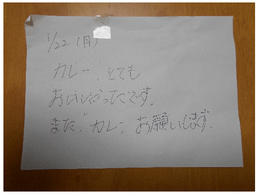 週一回、行政の配食サービスにて当店をご利用のお客様です。自分の歯が数本で入れ歯を入れることなく食事を召し上がられており、普段はお肉のおかずをお魚のおかずに変更してお届けしています。今回お届け日の献立がカレーライスになることをお伝えしたところ、「食べてみたい!」ということでしたので、お届けした際にお手紙を頂戴しました。ありがとうございました。