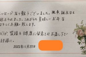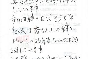 行政の地域包括支援センター担当者からのご紹介でお弁当のお試しをご利用になった方からのお手紙です。お客様はお母さま、ご主人、ご本人の3人暮らしで全員が要介護認定を受けています。嫁いだ娘さんが定期的にお世話をされているそうですが、娘さんの都合が合わないときには食事準備できないことが今後ありうるとのことでお試しでご利用いただきました。ありがとうございました。