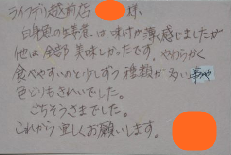 ライフデリ越前店へのお手紙をご紹介します。