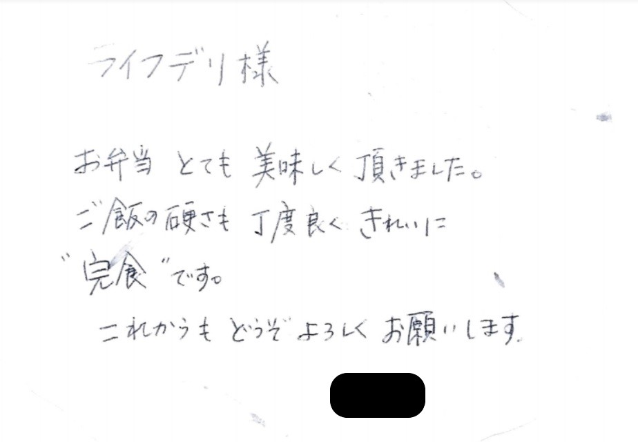 「ライフデリ様 お弁当とても美味しく頂きました。 ご飯の硬さも丁度良くきれいに ”完食”です。 これからもどうぞよろしくお願いします。 」とのことです。