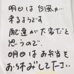 お客様宅近隣の工事の状況についてお教え頂き、配達員へのお心遣いを頂戴しました。配達の遅延は他のお客様にもご迷惑をお掛けしてしまうことになりますので、非常に助かります。遅れることの無いよう、前もって準備させて頂きます。