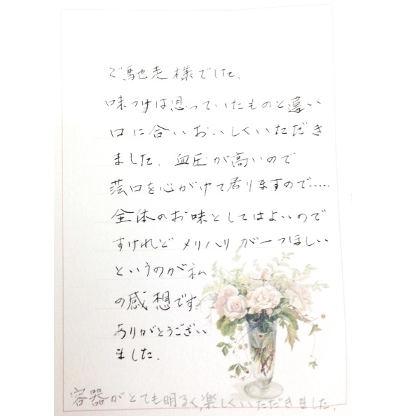 ライフデリ川越・富士見店に新規のお客様から感謝のお手紙を頂戴しました。ふだんあまり食べないような食材だったようですが、味がしっかりしていて美味しく食べられたとのことでスタッフ一同喜んでおります。