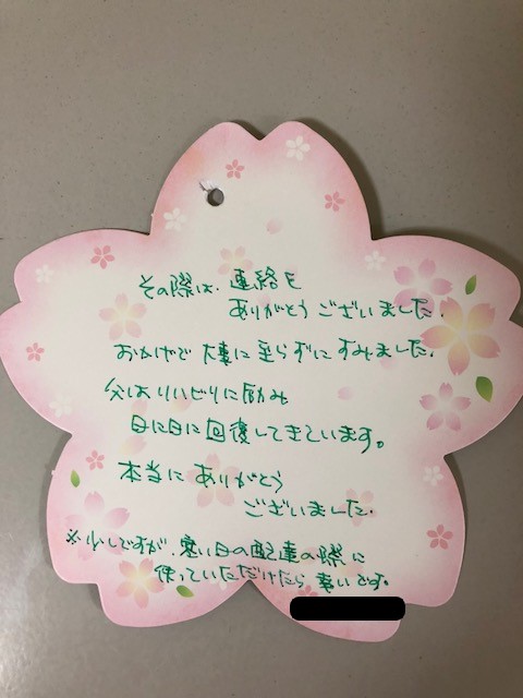 「その際は連絡をありがとうございました。おかげで大事には至らずすみました。父はリハビリに励み、日に日に回復してきています。本当にありがとうございました。※少しですが、寒い日の配達の際にお使いいただけたら幸いです。」とのことです。