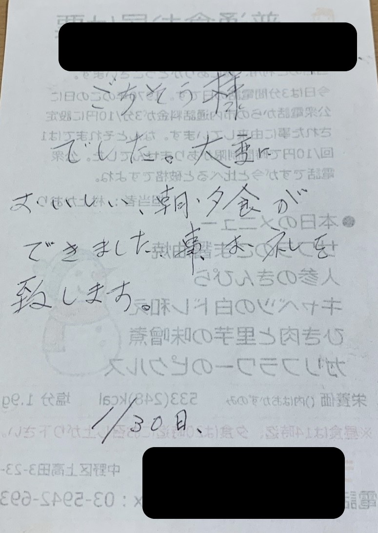 お客様の声2021.02.10 DELILIFE ライフデリ中野店にお手紙を頂戴しました! ライフデリ中野店へのお手紙をご紹介します。 「 ごちそう様でした。 大変においしい朝・夕食ができました事、お礼を致します。 」とのことです。 オープン月の12月から1日3食、週7日お弁当をお届けしている利用者さんです。いつもお届け票の裏にお手紙を書いて下さいます。ありがとうございました。 中野区でご高齢向けのお弁当をお探しの方、糖尿病・腎臓病の方は是非、高齢者配食サービスのライフデリ中野店にお任せ下さい。