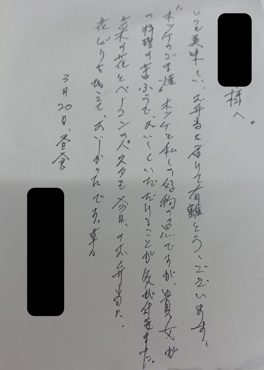 お客様の声2021.04.03 DELILIFE ライフデリ中野店にお手紙を頂戴しました! ライフデリ中野店へのお手紙をご紹介します。 「いつも美味しいお弁当を届けて有難うございます。 ホッケのごま焼き、ホッケも私の好物の魚です。 菜の花とベーコンのパスタも今日のお弁当に花どりを加えておいしかったです。」とのことです。 いつもニコニコしていてお弁当が届くのを楽しみして下さっているご利用者様です。1日3食、週7日お届けしています。ありがとうございました。 中野区でご高齢向けのお弁当をお探しの方、糖尿病・腎臓病の方は是非、高齢者配食サービスのライフデリ中野店にお任せ下さい。