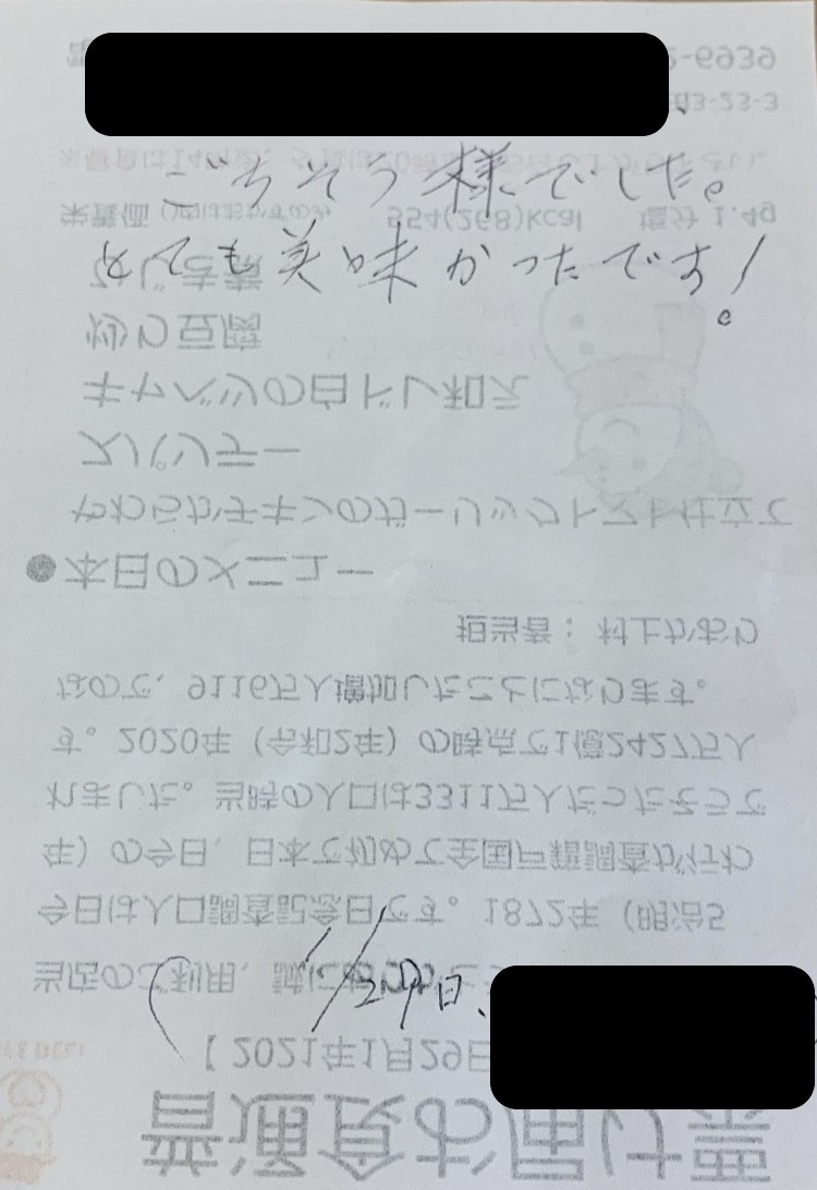 オープン月の12月から1日3食、週7日お弁当をお届けしている利用者さんです。いつもお届け票の裏にお手紙を書いて下さいます。ありがとうございました。