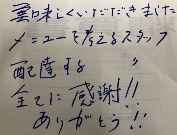 「美味しくいただきました。メニューを考えるスタッフ配達するスタッフ全てに感謝!!ありがとう!!」とのことです。