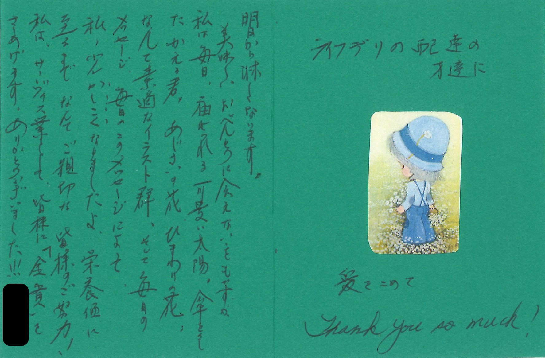 お客様の声2020.07.29 2025.02.07 DELILIFE ライフデリ前橋店にお手紙を頂戴しました! ライフデリ前橋店へのお手紙をご紹介します。 「残念ながらお弁当は一時休配となってしまいましたが、配達員をねぎらう,あたたかいお手紙を頂戴いたしました。」とのことです。 施設食に飽き、食欲もなくなってしまったとケアマネ様よりご相談あり、昼食、夕食をお届けしていました。 お弁当を楽しみにしてくださっていました。ありがとうございました。 前橋市でご高齢向けのお弁当をお探しの方、糖尿病・腎臓病の方は是非、高齢者配食サービスのライフデリ前橋店にお任せ下さい。