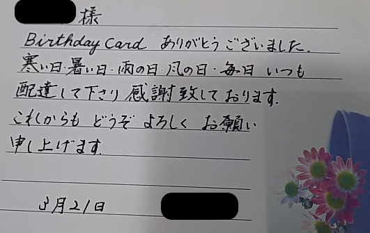 「「Birythday Card ありがとうございました。寒い日・暑い日・雨の日・風の日・毎日いつも配達下さり感謝致しております。これからもどうぞよろしくお願い申し上げます。」というお手紙を頂戴しました。」とのことです。