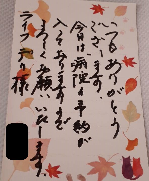 病院に行かれるということでお手紙をいただきました。1日二食毎日お届けさせていただいております。お身体が不自由なお客様で普段はテーブル近くまでお弁当をお持ちしています。異変がある際は、お声掛け、そして、ケアマネージャー様に報告させていただいています。安否確認も承ります。大田区高齢者食事はライフデリ大田店にお任せください。ありがとうございました。