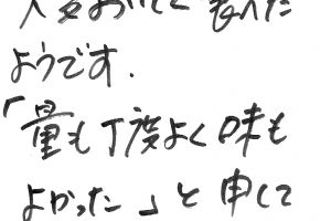 娘様がご両親のお食事を心配され、色々なお弁当屋さんに依頼をされたみたいですがなかなか受け入れてくださらなかったそうです。ケアマネ様から相談いただきお届け時にお手紙を添えたりなどの対応をしていく中、受け入れて下さるようになり、ご家族様がとても喜んでくださっております。このようなご家族様の仲の良さがうかがえる年賀状を頂けてとてもありがたく、また励みになります。ありがとうございました。