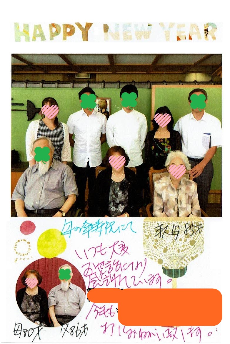 「母の傘寿祝にて。いつも大変お世話になり感謝しています。今年もよろしくおねがい致します。とのご家族様の仲の良さがうかがえる年賀状を、お客様のご家族様から頂戴しました。」とのことです。
