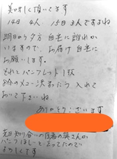 「お弁当の置き場所の変更と、注文数の確認と、8月のメニュー表と知人に紹介するのでパンフレットを下さいの内容、更に美味しく頂いています、というお手紙を頂きました。」とのことです。