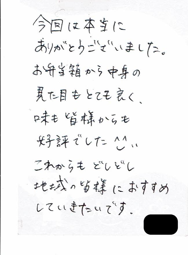 「「今回は本当にありがとうございました。お弁当箱から中身の見た目もとてもよく、味も皆様から好評でした。これからもどしどし地域の皆様におすすめしていきたいです。」というお手紙を頂戴しました」とのことです。