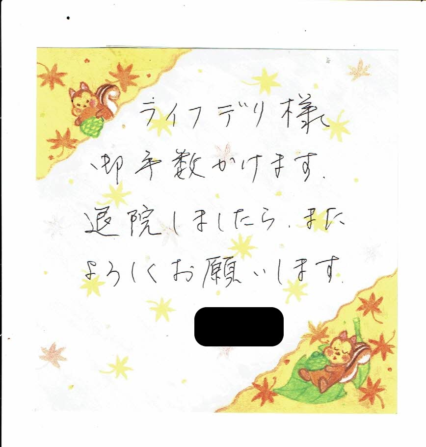 「「ライフデリ様 お手数掛けます 退院しましたらまたよろしくお願いします。」というお手紙を頂戴しました。」とのことです。