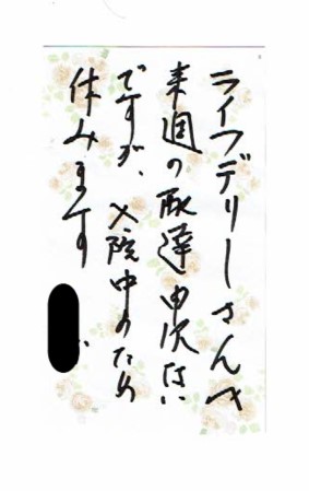 お客様の声2018.08.20 2018.09.06 DELILIFE ライフデリ宮崎店にお手紙を頂戴しました! ライフデリ宮崎店へのお手紙をご紹介します。 「「ライフデリさんへ来週の配達申し訳ないですが、入院のため休みます」というお手紙を頂戴しました。」とのことです。 最近開始されたお客様でおかずの味が良いとお褒めくださってました。少し体調を悪くされ1週間入院との事です。ありがとうございます。早くお体お元気になり、また配達でお会いできると良いですね! 宮崎市でご高齢向けのお弁当をお探しの方、糖尿病・腎臓病の方は是非、高齢者配食サービスのライフデリ宮崎店にお任せ下さい。