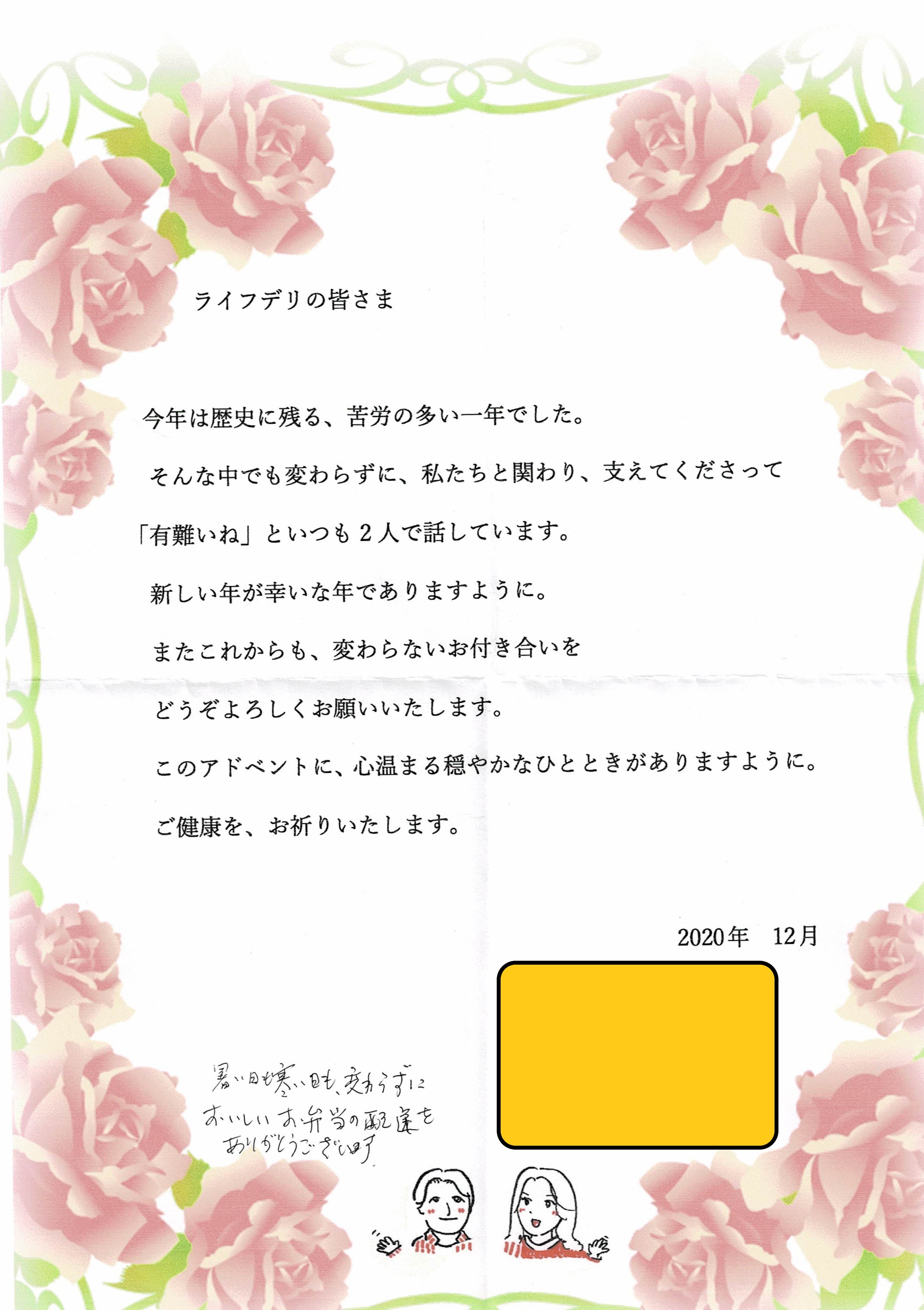 「ライフデリの皆さま 今年は歴史に残る、苦労の多い一年でした。 そんな中でも変わらずに、私たちと関わり、支えてくださって「有難いね」といつも2人で話しています。新しい年が幸いな年でありますように。またこれからも、変わらないお付き合いをどうぞよろしくお願いいたします。このアドベントに、心温まる穏やかなひとときにがありますように。ご健康を、お祈りいたします。 追記、暑い日も変わらずにおいしいお弁当の配達をありがとうございます。というお手紙を頂戴致しました。」とのことです。