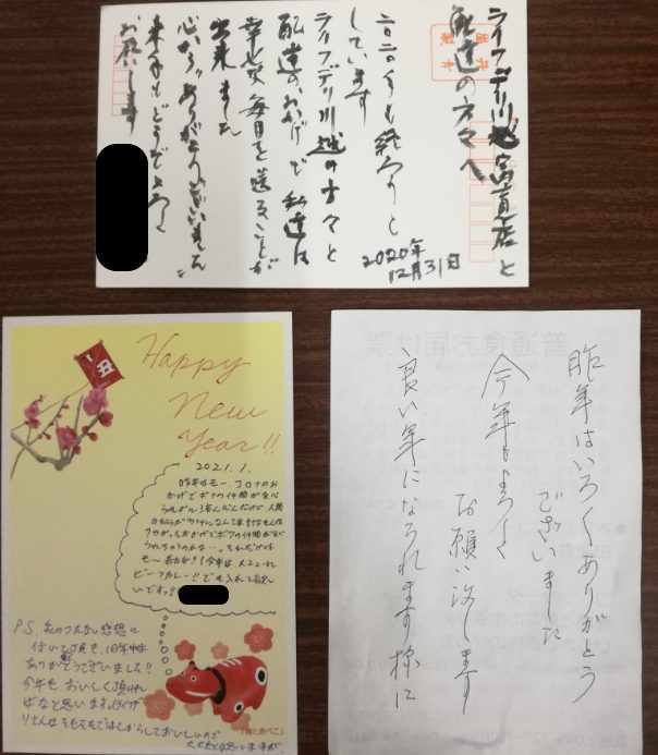 「昨年はいろいろとありがとうございました。今年もよろしくお願い致します・・・ライフデリ川越の方々と配達のおかげで私達は幸せな毎日を送ることが出来ました。心からありがとうございました・・・」とのことです。