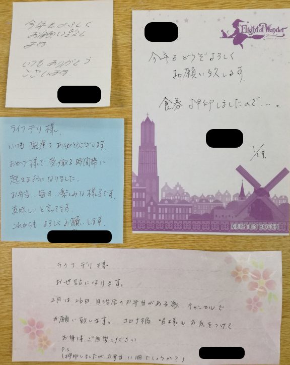 「いつも配達をありがとうございます。おかげ様で受け取る時間帯に起きるようになりました。お弁当、毎日楽しみな様子です。美味しいと言っています・・・いつもありがとうございます・・・コロナ禍、皆様もお気をつけてお身体ご自愛ください」とのことです。