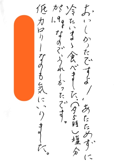 お客様の声2019.07.30 2025.11.19 DELILIFE ライフデリ市川店にお手紙を頂戴しました! ライフデリ市川店へのお手紙をご紹介します。 「『美味しかったですよ!』塩分控えめ低カロリーなので気に入っております」とのことです。 デイサービスを週二回ご利用されているお客様で、週三回当店を利用されているお客様です。他の宅配サービスより美味しいとのことで、お手紙を頂戴しました。ありがとうございました。 市川市でご高齢向けのお弁当をお探しの方、糖尿病・腎臓病の方は是非、高齢者配食サービスのライフデリ市川店にお任せ下さい。