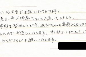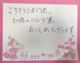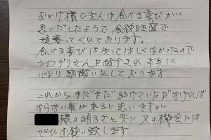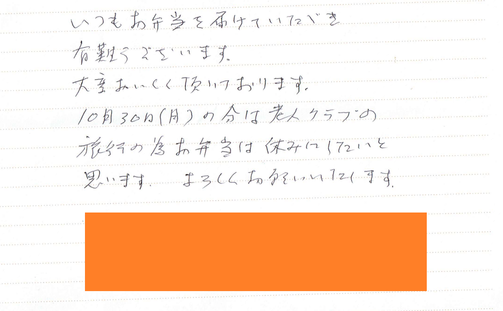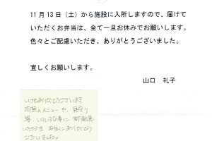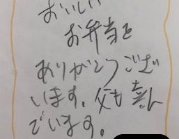 お客様の声2021.10.30 LIFEDELI ライフデリ彦根店にお手紙を頂戴しました! ライフデリ彦根店へのお手紙をご紹介します。 「完食です。 いつもありがとうございます。」とのことです。 継続してムース食ご利用のお客様です。 いつもお弁当の空箱にメッセージを付けてお返し頂いております。 お客様からの嬉しいお便りは、大変励みになります。 彦根市でご高齢向けのお弁当をお探しの方、糖尿病・腎臓病の方は是非、高齢者配食サービスのライフデリ彦根店にお任せ下さい。