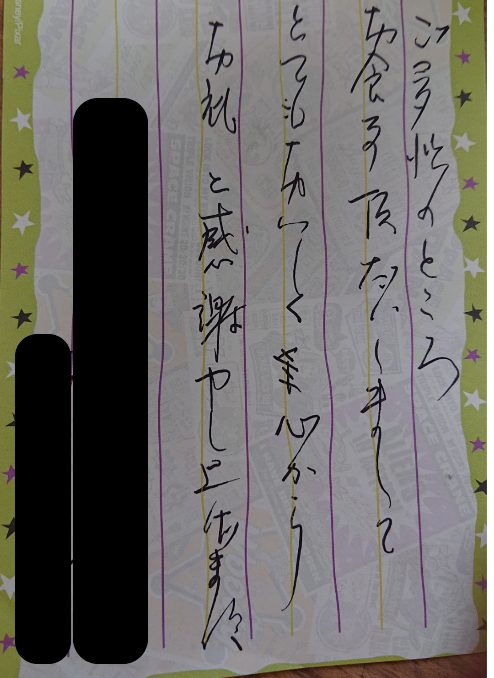 当店のお弁当を始めてご利用頂いた際に頂戴しました。 近所に買い物も行けないので非常に助かりますとお声がけいただきました。ありがとうございました。