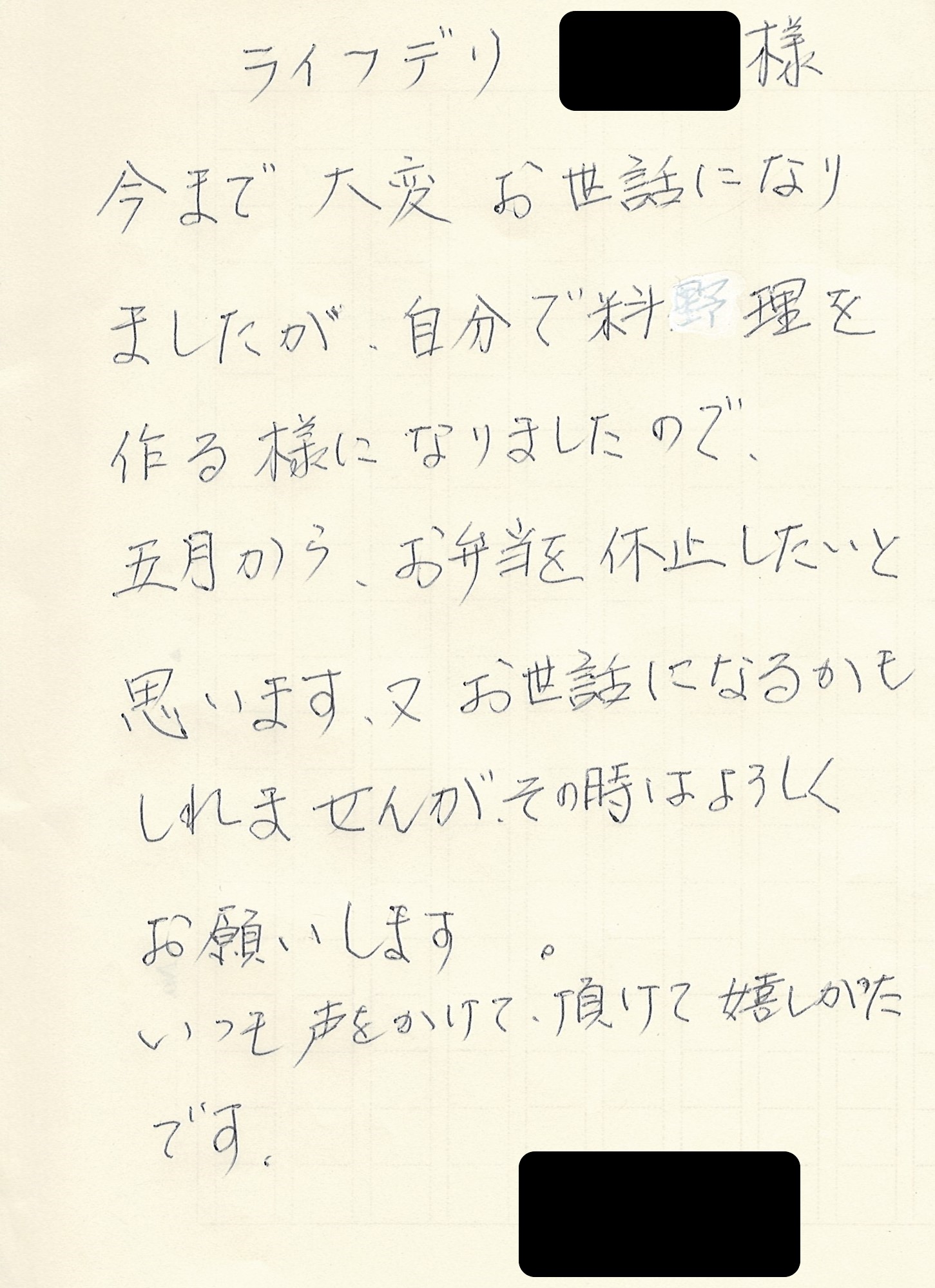「今まで大変お世話になりましたが、自分で料理を作る様になりましたのて、5月からお弁当を休止したいと思います。又、お世話になるかもしれませんが、その時はよろしくお願いします。いつも声をかけて頂けて嬉しかったです。」とのことです。
