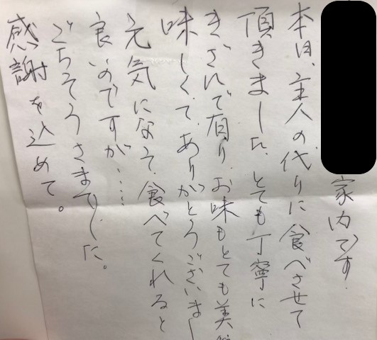 ショートステイでいつも御利用者様を御紹介いただく施設様の御利用者様。 この手紙をいただいた翌日の本日から入院のため休止になりましたが、御主人が食べられない日に奥様が食べて感謝されたものです。ありがとうございました。
