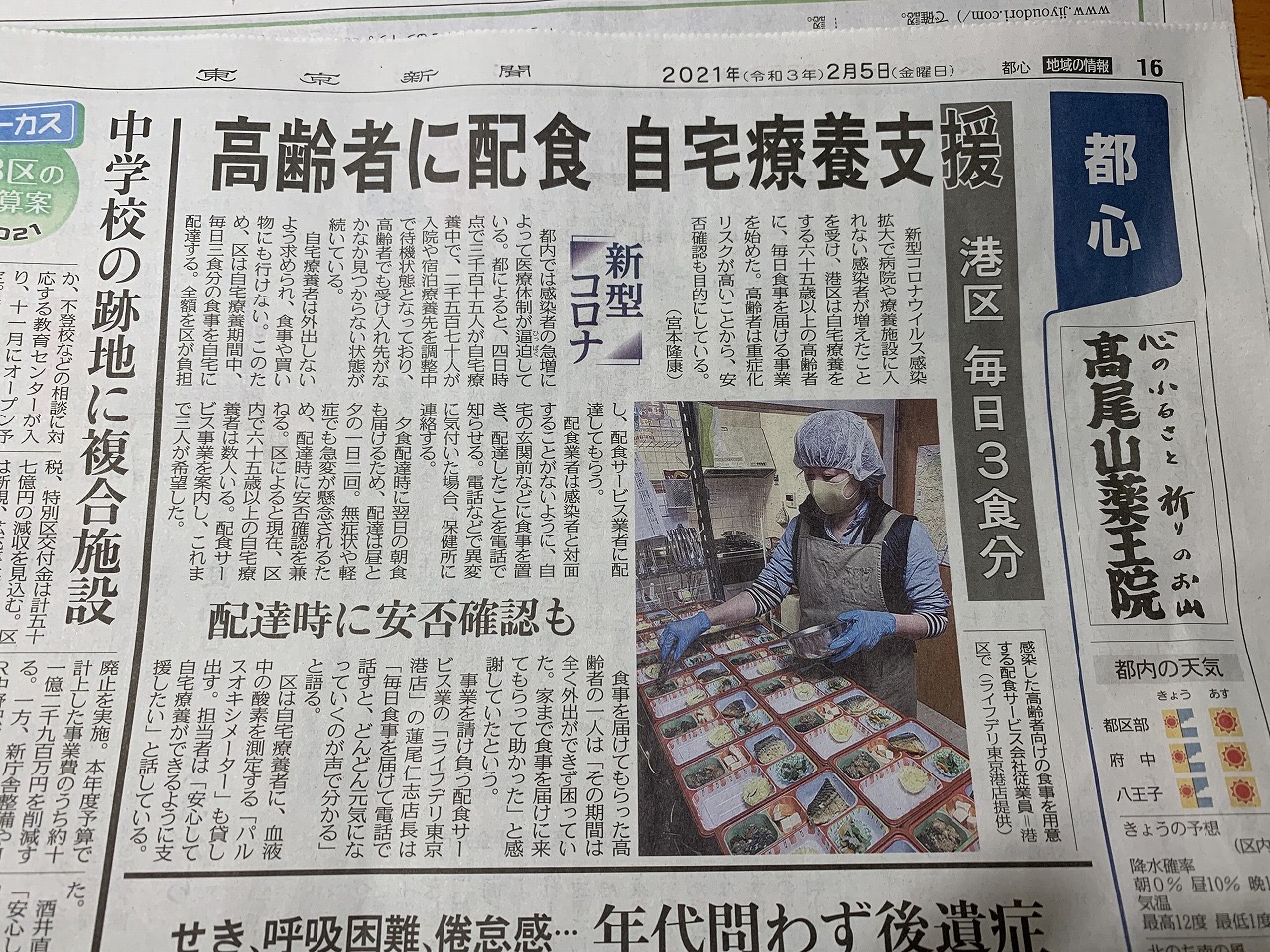 「東京新聞社様の2/5朝刊に、コロナウイルスに関連する港区と当店の「自宅療養者向け配食サービス」の取り組みが掲載されました。」とのことです。