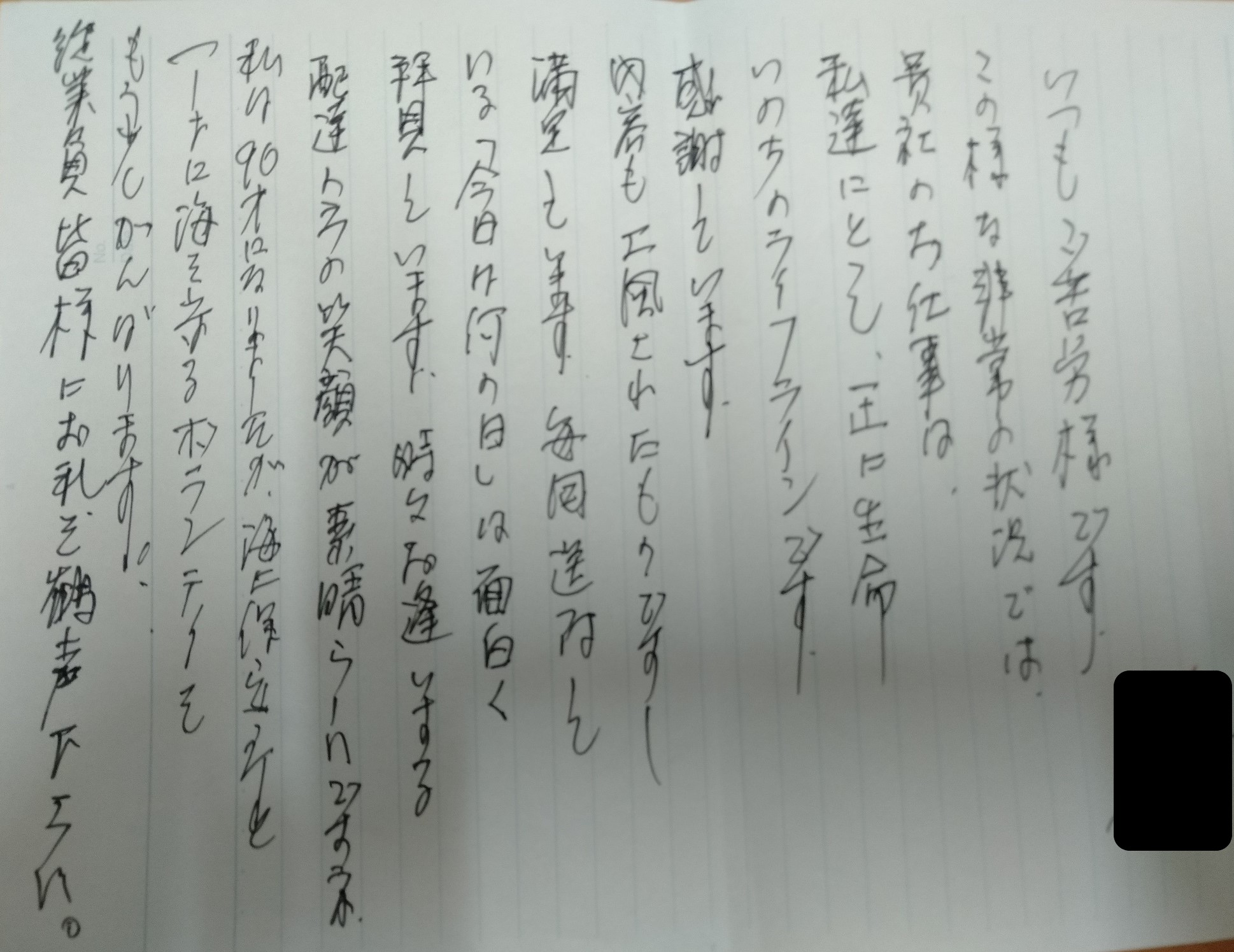 「いつもありがとう。 あなたたちの仕事は私たちのライフラインです。 というお手紙をいただきました。」とのことです。