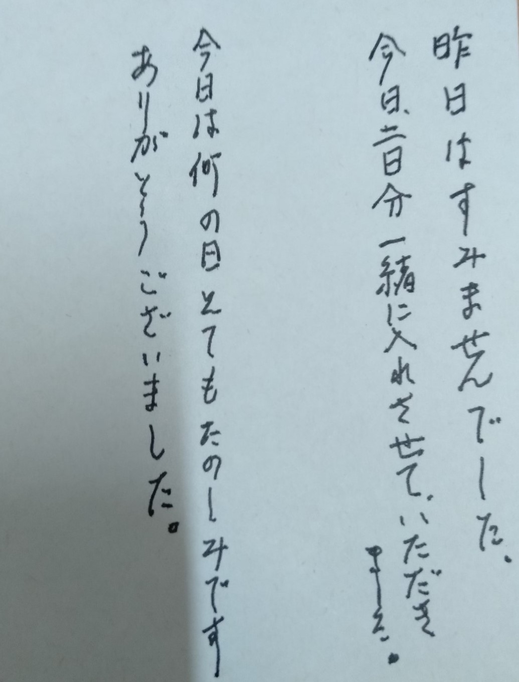 お弁当容器を返却し忘れてしまったようで、お手紙を書いていただきました。 お弁当のメニュー票に書いてある『今日は何の日』の記事を読むことを楽しみにしてくれていると書いてくれていました。ありがとうございました。