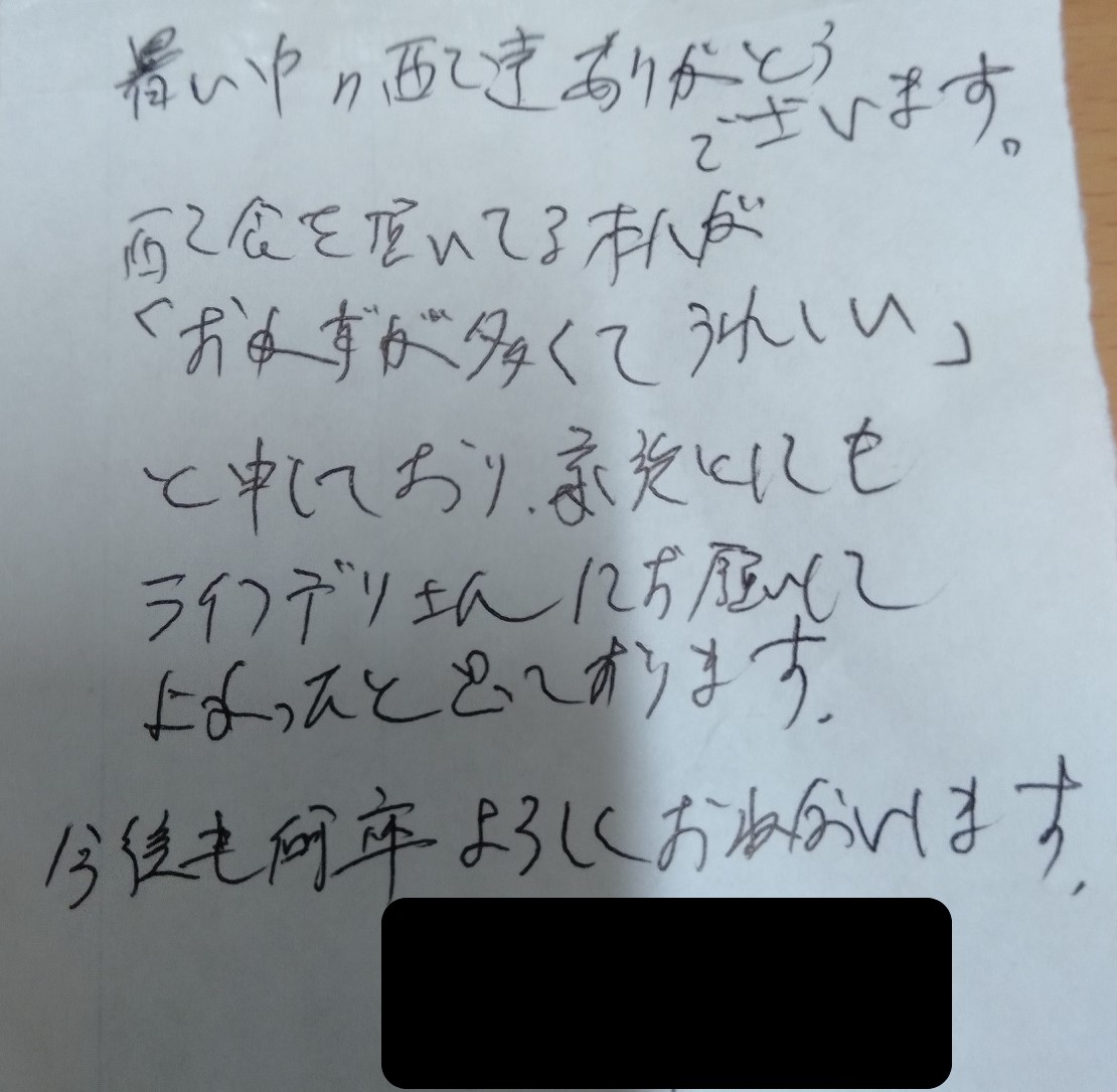 ご家族から、お弁当を取られているお母さまが「おかずが多くてうれしい」とおっしゃっているようで、家族としても、ライフデリにお願いしてよかったと、感謝のお手紙をいただきました。ありがとうございました。