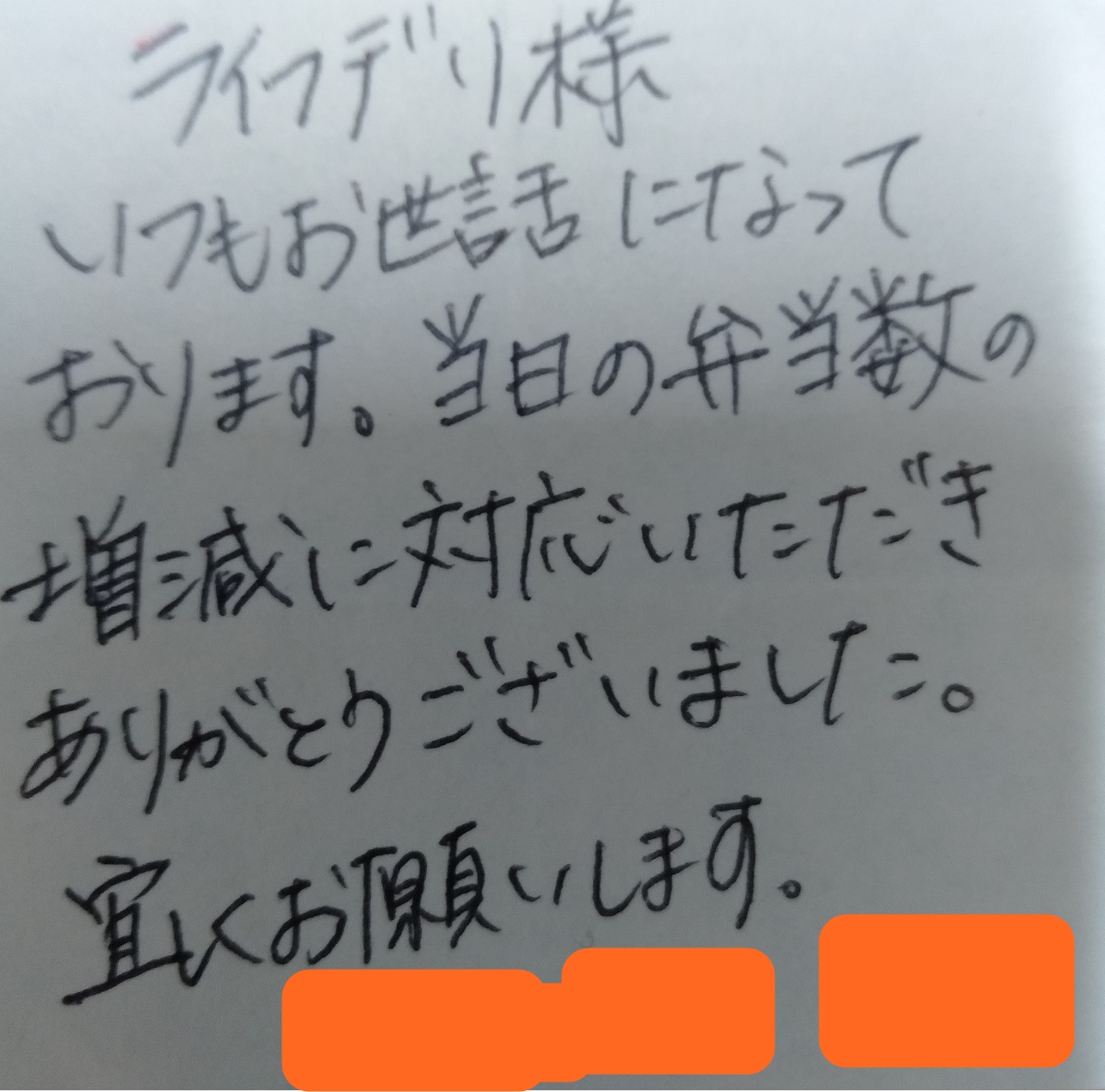 デイサービスのセンター長様から、突然の食数変更(増加)に対して対応したことについてのお礼のお手紙をいただきました。ありがとうございました。