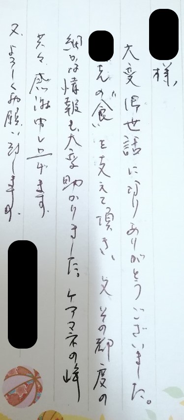 「ご利用者様が施設に入所するにあたり担当ケアマネジャー様から助かりましたというお手紙です。」とのことです。