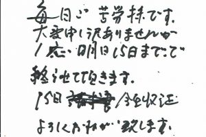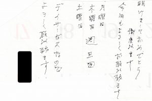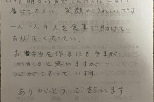 お客様の声2019.02.14 DELILIFE ライフデリ焼津店にお手紙を頂戴しました! ライフデリ焼津店へのお手紙をご紹介します。 「うまい。」とのことです。 配食サービスを初めてご利用いただいたお客様です。当店のお弁当を大変気に入って下さり、シンプルですがとても嬉しいお手紙を頂戴しました。ありがとうございました。 焼津市でご高齢向けのお弁当をお探しの方、糖尿病・腎臓病の方は是非、高齢者配食サービスのライフデリ焼津店にお任せ下さい。