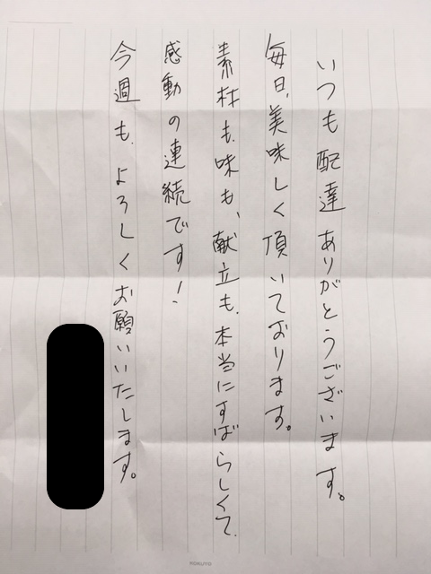 「いつも配達ありがとうございます。毎日、美味しく頂いております。素材も、味も、献立も、本当にすばらしくて感動の連続です。今週もよろしくお願いいたします。」とのことです。