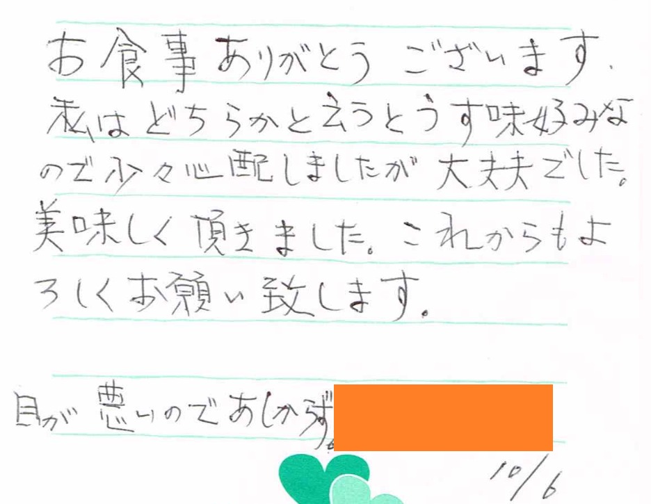 お客様の声2018.10.09 2025.11.19 DELILIFE ライフデリ諏訪店にお手紙を頂戴しました! ライフデリ諏訪店へのお手紙をご紹介します。 「うす味が好みなので少々心配しましたが大丈夫でした。美味しく頂きました。」とのことです。 ケアマネさんからのご紹介で、新規にお届けしたお客様から、2回お届けした後に頂戴しました。ありがとうございました。 諏訪市・下諏訪町・岡谷市でご高齢向けのお弁当をお探しの方、糖尿病・腎臓病の方は是非、高齢者配食サービスのライフデリ諏訪店にお任せ下さい。