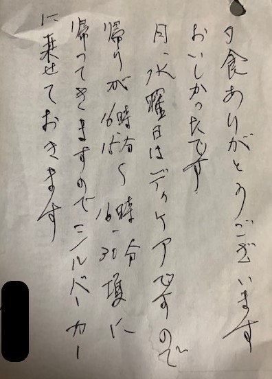 「夕食ありがとうございます おいしかったです 月・水曜日はデイケアですので帰りが16:15~ 16:30頃に帰ってきますのでシルバーカーに 乗せておきます」とのことです。