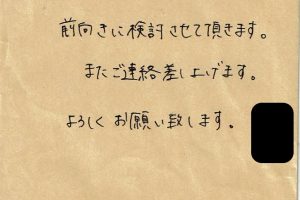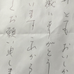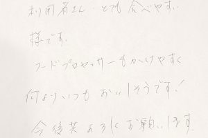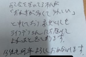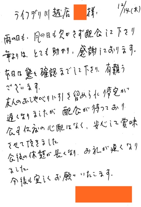 長期間ご利用頂きましたお客様から感謝のお手紙を頂戴しました。ご自身でお食事の準備ができるまで元気になられたとのことで、店舗としても嬉しい限りです。