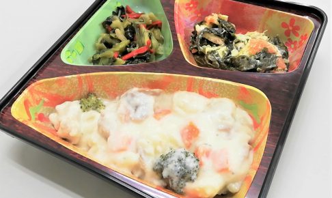 医療食を検討されている方にご参考頂けるように 実際に提供されたメニューをご紹介したいと思います。 今回は「腎臓食」のおかずセットです。 【メニュー】・チキンクリームシチュー・チンゲン菜とピーマンのソテー・和風サラダ 【栄…