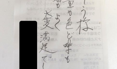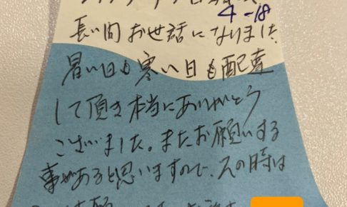 ライフデリ江戸川店へのお手紙をご紹介します。 「おべんとう、ありがとうございました。手塚」とのことです。 毎日刻み食で昼夕とお届けしていました。ご家族から施設の入所が決まったとのことで最後の日に菓子折りとお手紙をいただき…