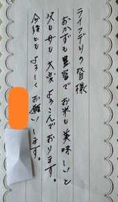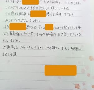 ライフデリ昭島・あきる野・福生店へのお手紙をご紹介します。 「ご利用されているご両親が、おかずが豊富でお米も美味しく大変喜んでいます、とのお手紙頂きました。」とのことです。 ご利用開始後まもなく娘様より、ご利用されてるご…