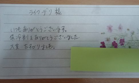 ライフデリ横浜川崎店へのお手紙をご紹介します。 「いつもありがとうございます。保冷剤をありがとうございました。大変たすかりました。」とのことです。 毎日配達のお客様がご不在でしたので、保冷剤を入れて保冷バッグで置き配した…